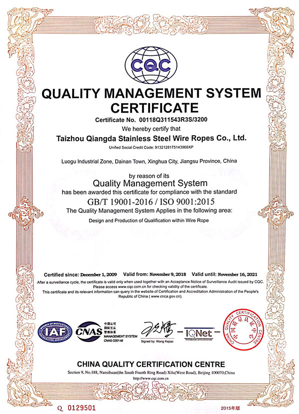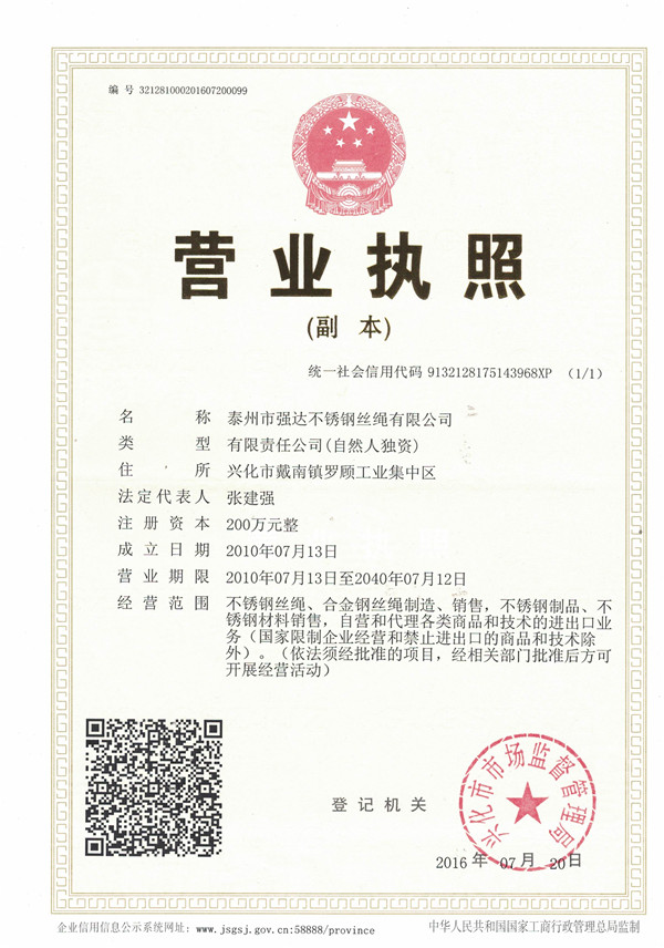 泰州市強(qiáng)達(dá)不銹鋼絲繩有限公司位于江蘇興化市戴南經(jīng)濟(jì)開發(fā)區(qū),公司致力于不銹鋼絲繩產(chǎn)品生產(chǎn),立志成為“國內(nèi)技術(shù)標(biāo)桿型吊索具生產(chǎn)企業(yè)”。以此戰(zhàn)略思想指導(dǎo),公司堅(jiān)決貫徹“質(zhì)量贏市場,管理增效益,誠信贏天下”的質(zhì)量方針。以完善的服務(wù)在國內(nèi)不銹鋼絲繩市場樹立良好的品牌形象。公司榮獲“江蘇省質(zhì)量信得過企業(yè)。 靈活的管理機(jī)制,經(jīng)驗(yàn)豐富的